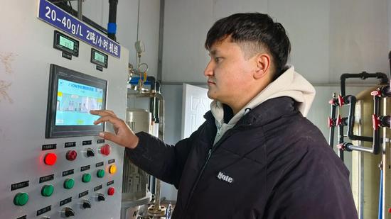 新疆巴楚粤水电光伏发电盐碱水淡化水土协同改良种植项目经理邹新说:“这套设备是浙江大学研发的淡化水净化设备。它能把巴楚盐碱度极高的盐碱水,淡化成可供食用、灌溉农田的水。其核心在于里面的膜,通过这层膜,将高浓度盐碱水淡化后,用于灌溉冬小麦、油莎豆和油菜。”
