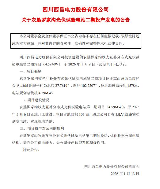 1月13日,西昌电力发布关于农垦罗家沟光伏试验电站二期投产发电的公告。