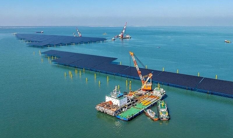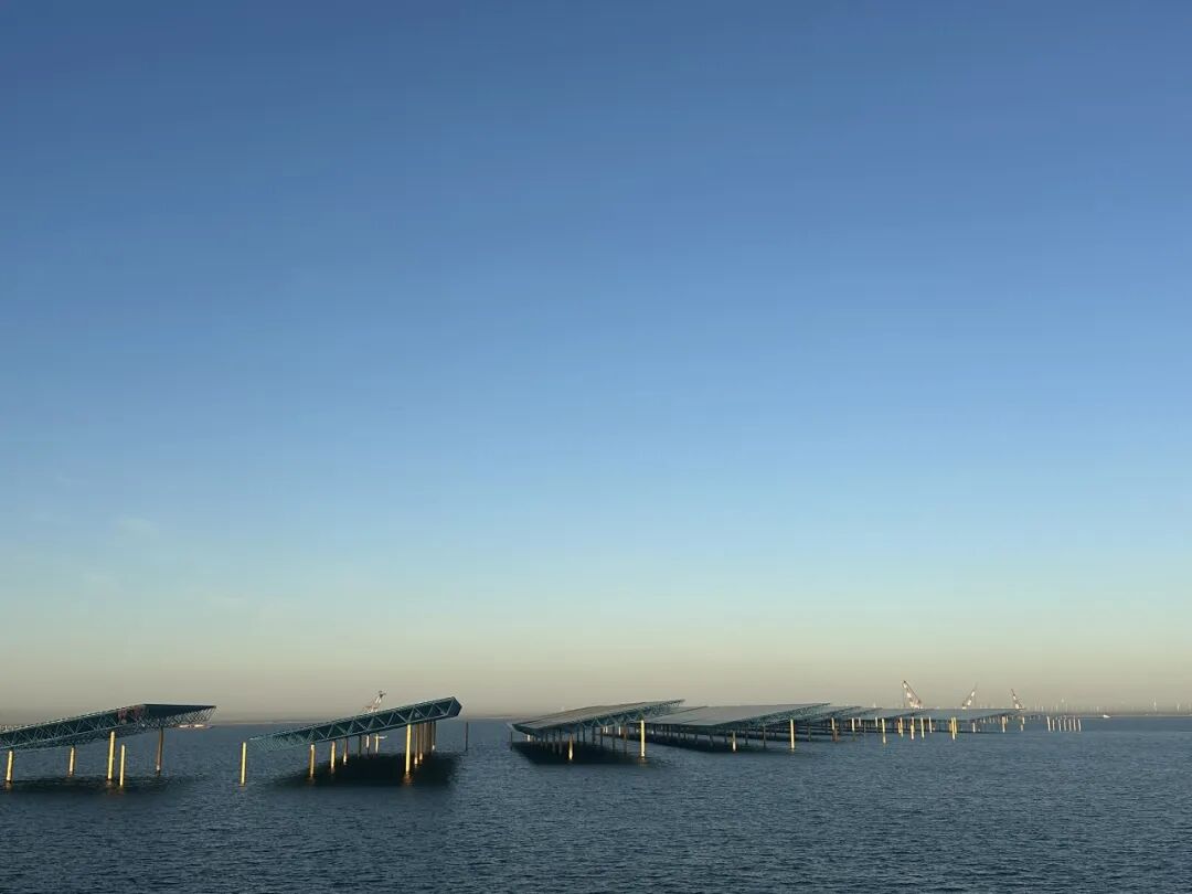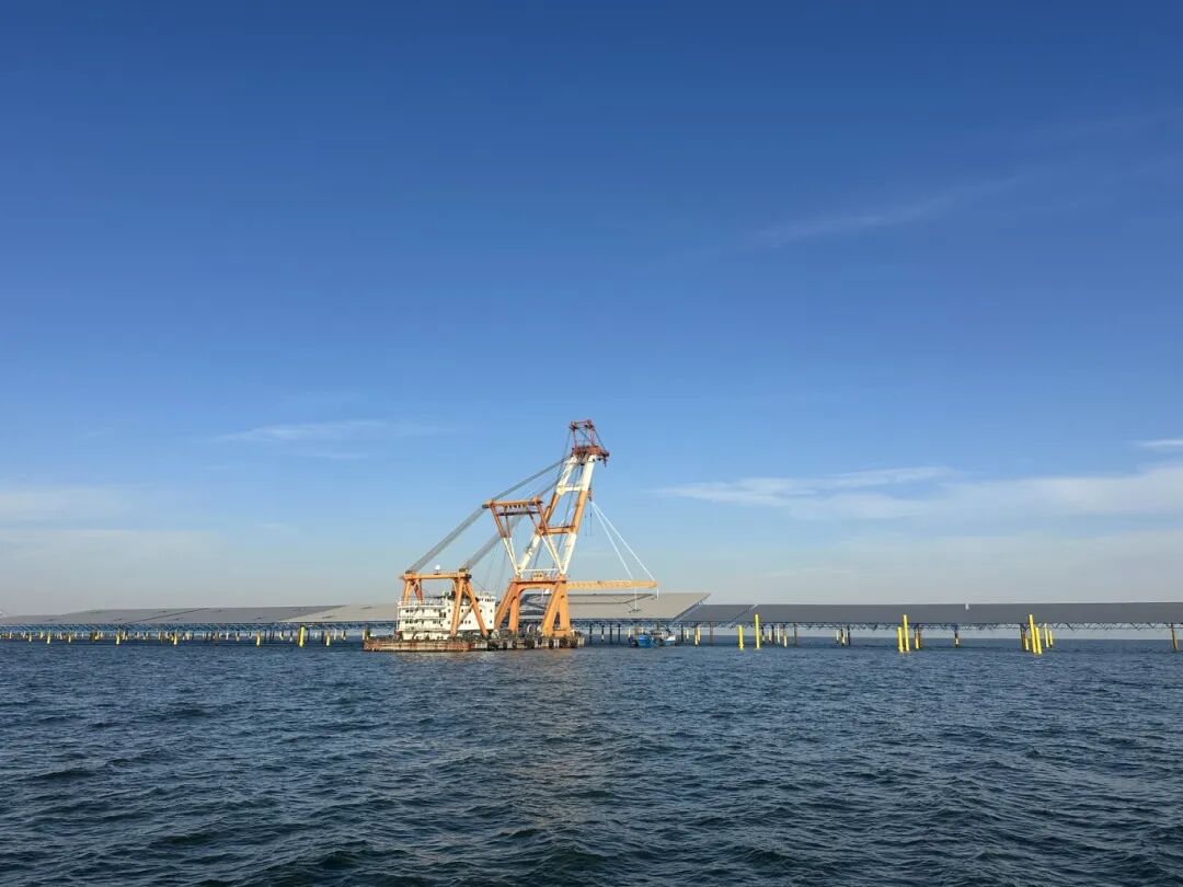 建设过程中,项目团队创新使用“1主+4次”的吊装设备,确保吊装精准度,采用多项新技术:吸力筒式稳桩平台提高打桩精度、光伏板聚氨酯边框对抗海水腐蚀、“定向钻穿越+海缆回拖”方案实现了集电线路在保护区地下的无损穿越,有效保护生态环境。成功攻克海上施工环境复杂、设备稳定性要求高等难题,确保了项目安全高效推进。