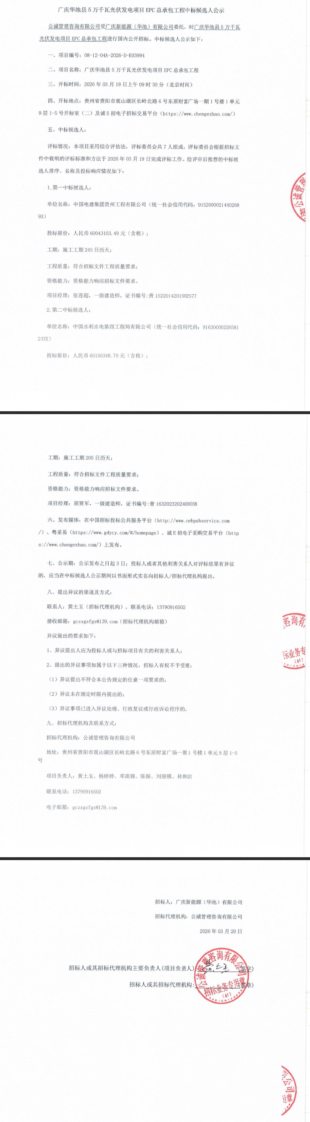 光伏头条获悉,3月20日,广庆华池县5万千瓦光伏发电项目EPC总承包工程中标候选人公示。
