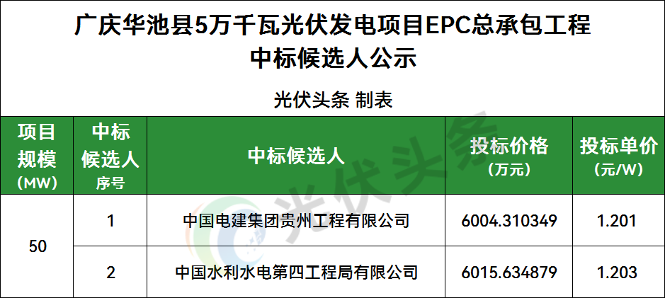 中国电建集团贵州工程有限公司、中国水利水电第四工程局有限公司入围,投标单价1.201~1.203元/W。