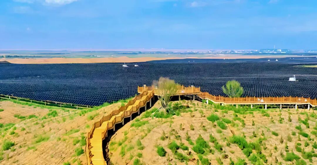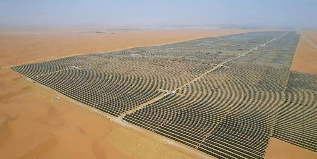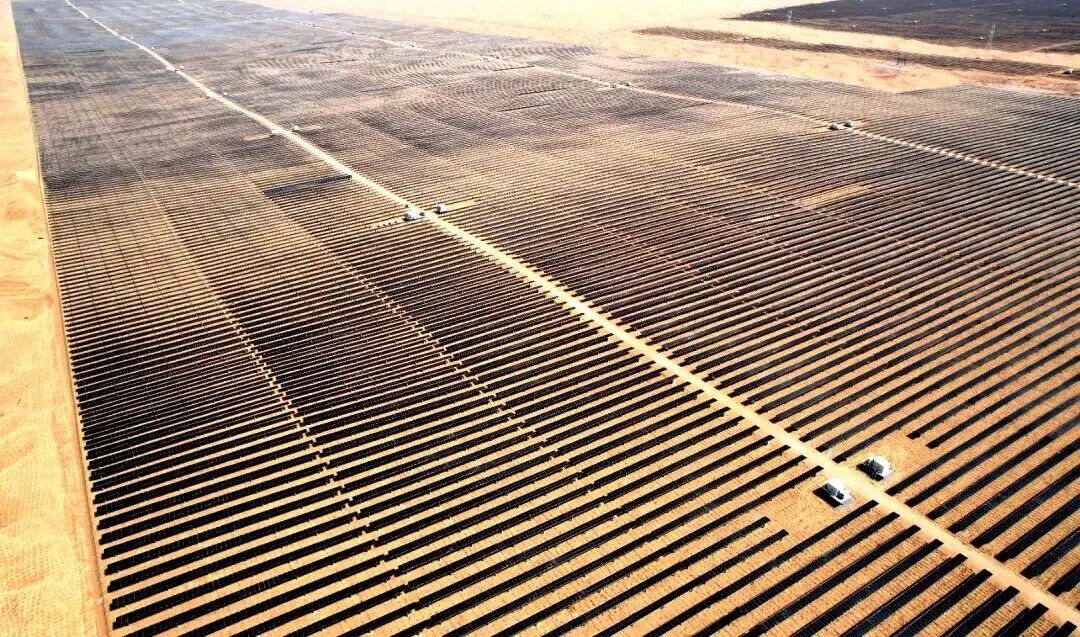 这一承载特殊使命的能源基地,创下了我国沙戈荒大基地开发史上的三项"全国之首":它是国家发改委和国家能源局“双批复”的首个“沙戈荒”能源大基地,是国家千万千瓦级“沙戈荒”基地中首个备案、开工、投产的项目,还是国家第一条以开发沙漠光伏大基地、输送新能源为主的特高压输电通道——“宁湘直流”工程的重点配套项目。