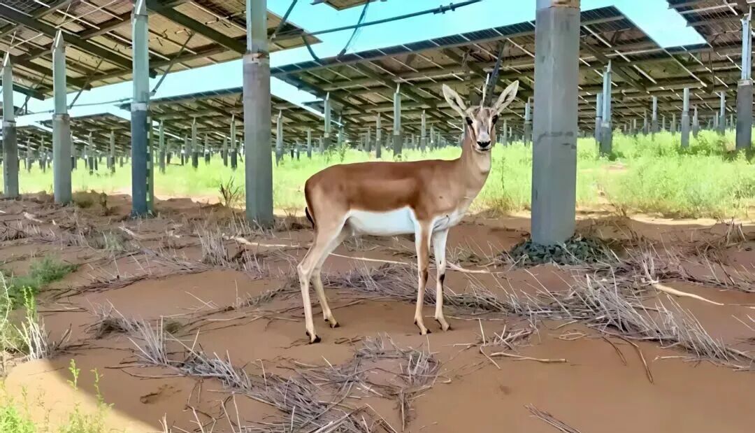项目创新采用高支架设计,每排板之间预留近7米的间隙,为实现"板上发电、板下修复,板间种植"的生态模式留足空间。实测数据显示,大型光伏电站可降低50%风速,减少地表水分蒸发量30%,有效抑制沙子移动,为植物生长创造有利条件。项目区域植被覆盖率从不足0.5%提升到20%,局部区域达到50%。
