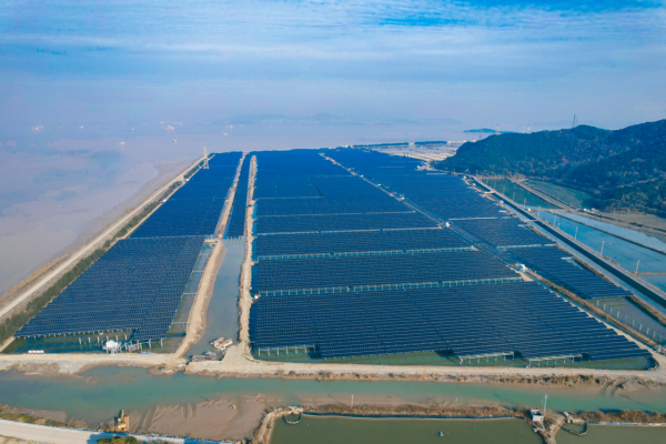在浙江省舟山群岛的登步岛,一片片深蓝色的光伏板整齐地覆盖在波光粼粼的鱼塘之上,构成了一幅科技与自然和谐共生的崭新图景。