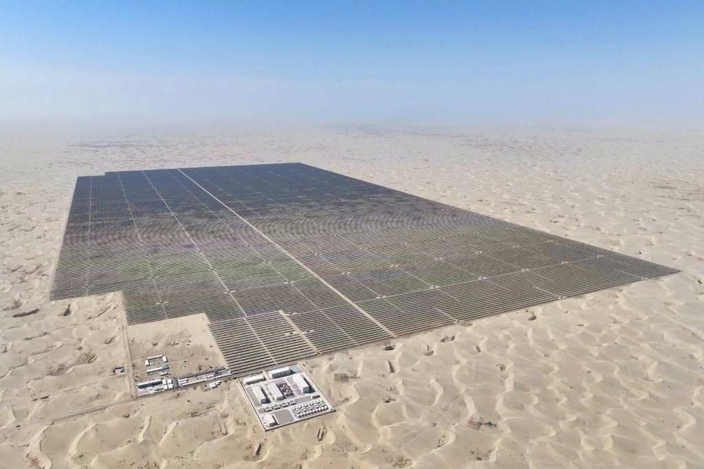 盛夏时节,新疆喀什地区麦盖提县境内,塔克拉玛干沙漠西缘铺展着一片广袤的“蓝色海洋”。错落有致的光伏板在烈日下熠熠生辉,宛如为沙漠镶嵌的巨型镜面,将取之不尽的太阳能转化为清洁电力,持续不断地送往城乡各地。谁能想到,这片生机勃勃的光伏产业园区,一年前还是沙海连绵的荒漠,如今已摇身一变,成为“光伏+治沙+产业”的典范项目。