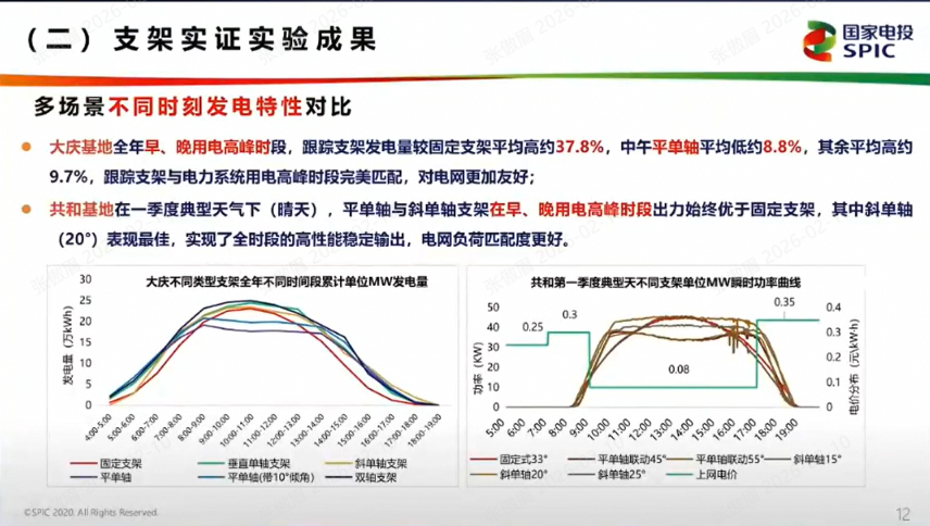 报告中分享了国电投在青海共和、四川甘孜及黑龙江大庆不同实证场景下光伏组件、支架、光储一体化、光伏生态效应等方面的实证成果。其中跟踪支架在提升电站整体发电量及早峰提前增供,午时压峰稳供,午后延时增供等方面的潜力显著,这一成果或许为光伏项目在136号文新政下的投资测算提供了新的思路和参考。