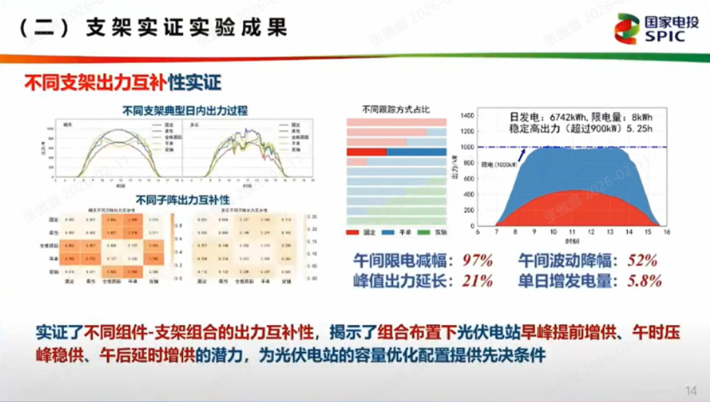 除验证不同支架技术的发电性能差异外,实证基地还做了不用支架组合的实验,揭示组合布置下光伏电站早峰提前增供,午时压峰稳供,午后延时增供的潜力,为光伏电站的优化配置提供了先决条件。实证结果展示,通过不同支架方式的组合,可实现午间限电减幅97%,午间波动降幅52%,峰值出力延长21%,单日增发电力5.8%。
