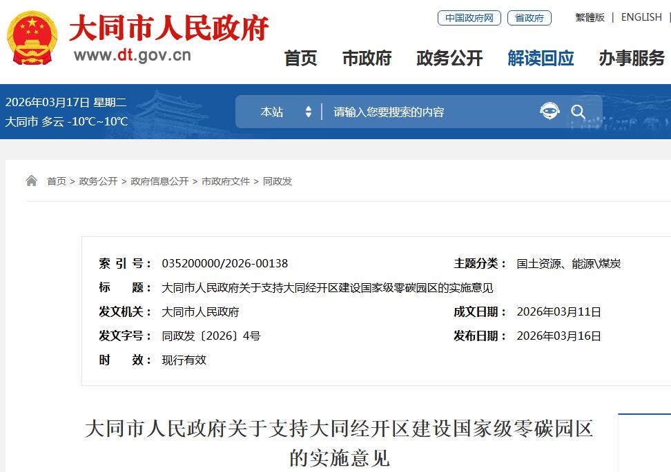 3月16日,山西省大同市人民政府印发《关于支持大同经开区建设国家级零碳园区的实施意见》。