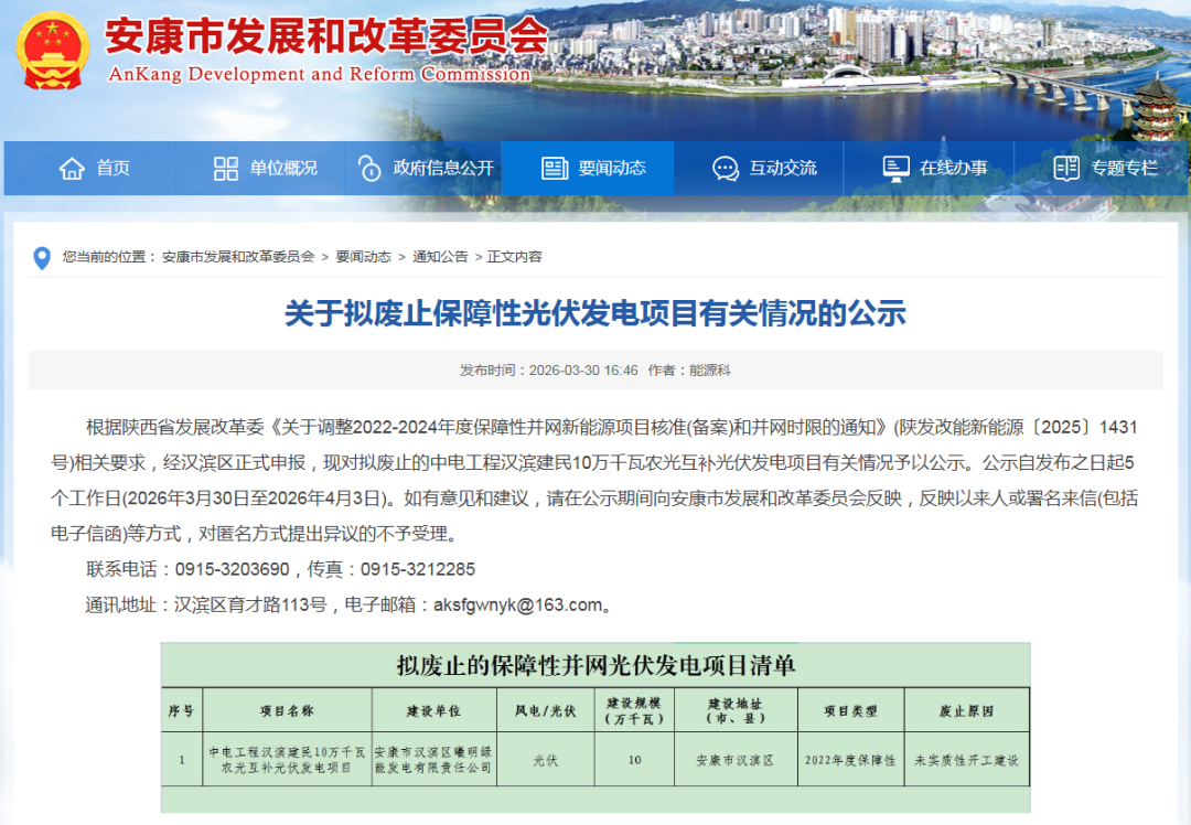 光伏头条获悉,3月30日,陕西省安康市发展和改革委员会公示拟废止保障性光伏发电项目有关情况。