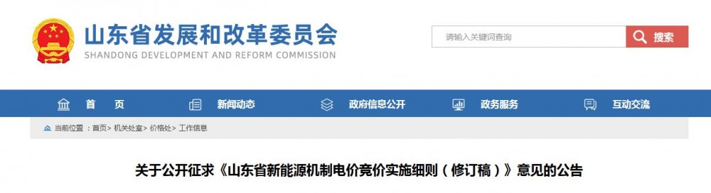 关于公开征求《山东省新能源机制电价竞价实施细则(修订稿)》意见的公告