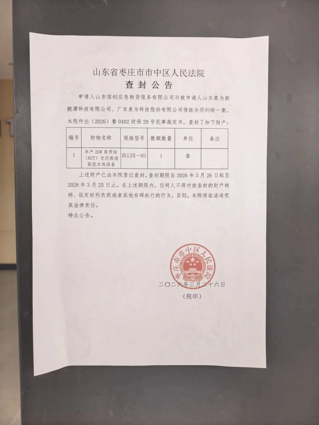 在山东泉为西侧大厅门口最显眼的位置,张贴着枣庄市市中区人民法院查封公告,落款时间为2026年3月26日。公告显示,山东泉为“年产2GW异质结(HJT)光伏板组装流水线设备”遭查封,期限两年。