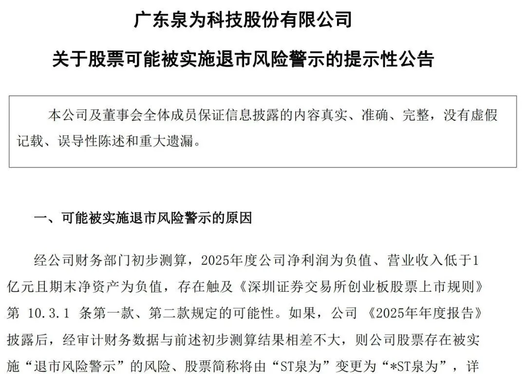 真正的断崖出现在2025年。根据2026年1月30日披露的业绩预告,泉为科技2025年全年营业收入预计仅为4500万元至6300万元。而2025年半年报显示,上半年营收为4620.4万元。这意味着,2025年下半年泉为科技的营收最多不超过1700万元。同时,2025年泉为科技归属于上市公司股东的净资产由正转负,预计为-1.23亿元至-1.72亿元,触发退市风险警示。