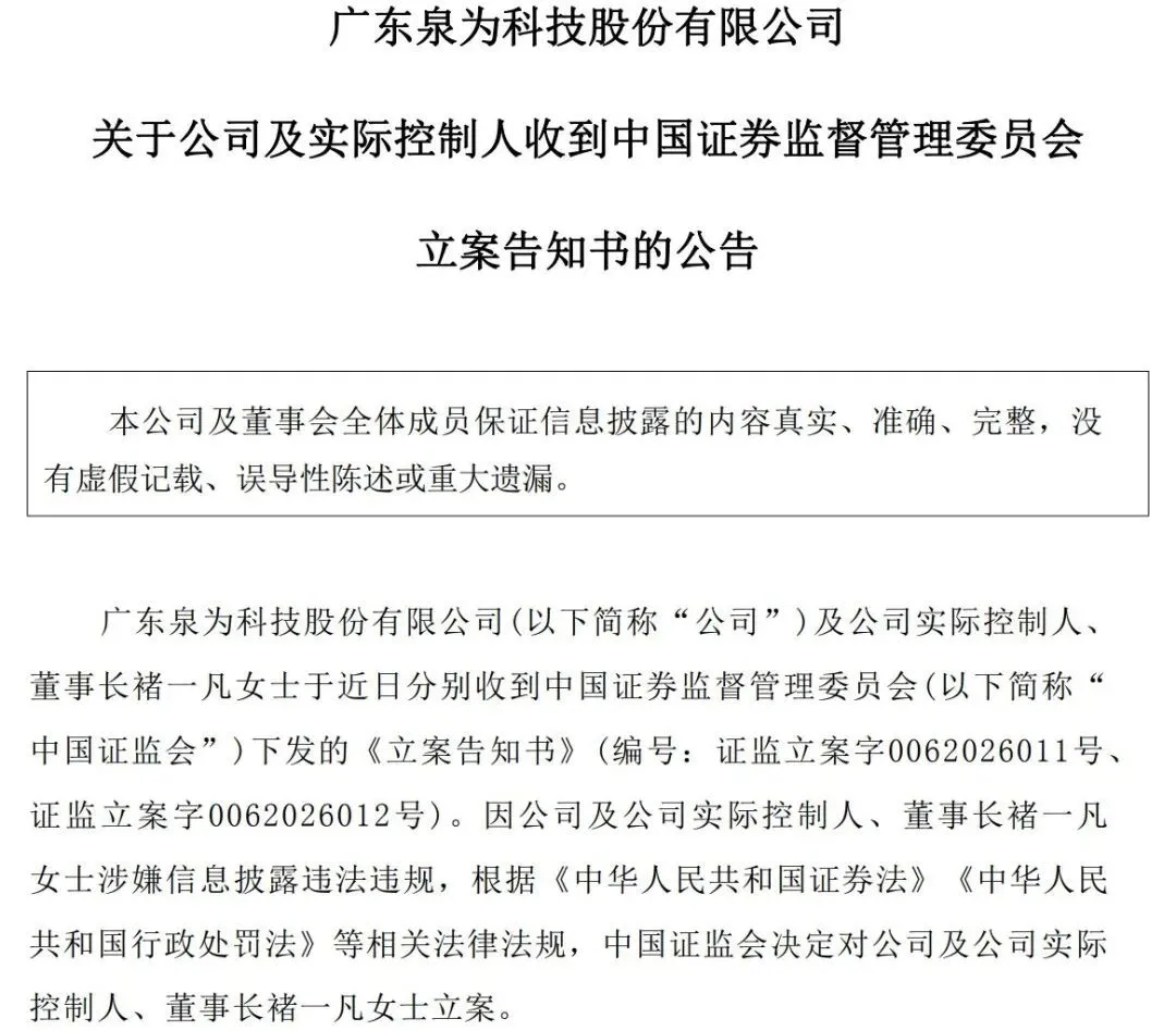 2025年7月,山东泉为以厂房抵押向枣庄银行借款的1亿元到期,剩余7990万元逾期,被银行提起诉讼。同年12月,安徽泉为名下位于泗县的厂房、员工宿舍、展示中心被法院评估、拍卖。今年3月,泉为科技2GW异质结产线设备被法院查封;同月,泉为科技及褚一凡被证监会立案调查。