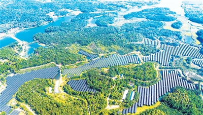 10月10日,江西省宜春市上高县新界埠镇端溪村,一块块蓝色光伏发电板整齐排列在星罗棋布的鱼塘中,与村舍、山林、湖泊等相互映衬,蔚为壮观,源源不断发出“绿电”的同时,助力乡村绿色发展。