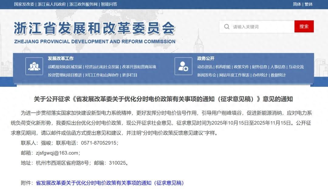 为进一步贯彻落实国家加快建设新型电力系统精神,更好发挥分时电价信号作用,引导用户削峰填谷,促进新能源消纳,应对电力系统负荷变化新形势,我委拟出台优化分时电价政策,现公开征求社会意见,征求意见时间为2025年10月15日至2025年11月15日。公开征求意见期间,请以邮件或信函方式提出意见和建议,并注明“分时电价政策反馈意见建议”字样。